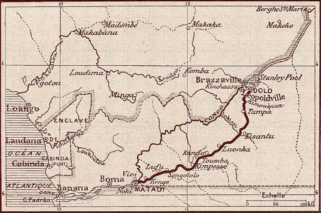 Om 8u00 precies vertrekken we. We rijden door een tunnel en dan volgen we de rivier die we 20 meter lager zien. Ik kan de geschiedenis van deze treinlijn niet vertellen, maar je moet weten hij bijna 400 km lang is, veel langer dus dan de afstand Oostende – Luxemburg stad. Onze trein, die qua comfort en keuken kan concurreren met de Étoile du Nord, stopt aan elk station. De inheemse bevolking op een rijtje achter de slagbomen biedt ons, tegen betaling, ananassen, bananen, enz. Op andere momenten onderweg verrassen we kleine zwartjes die in het water spelen, poedelnaakt natuurlijk, en dan een spurt inzetten om de trein te zien voorbijrijden. De stations zijn zo mooi dat niet één Belgisch station de vergelijking kan doorstaan.